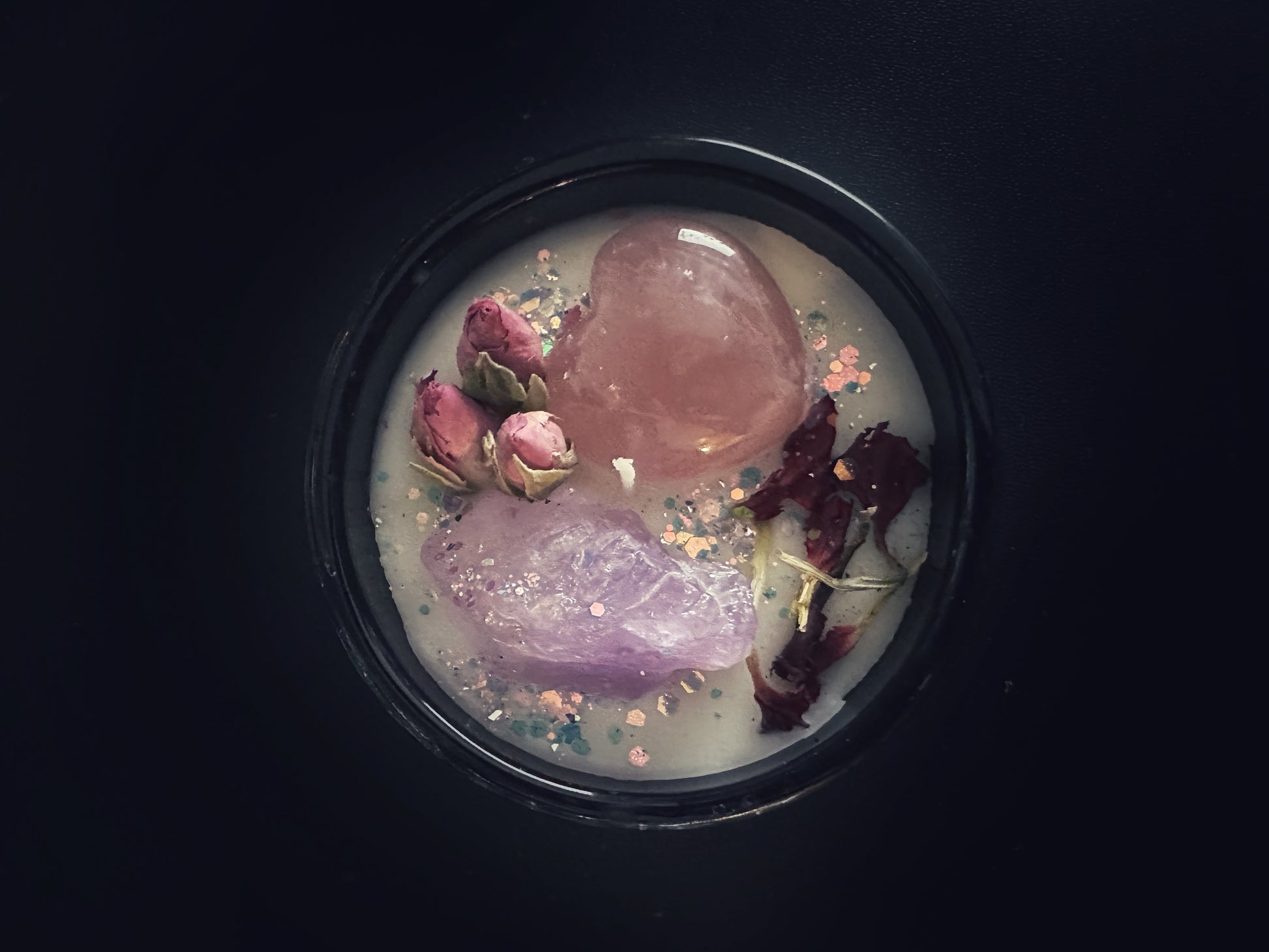 Adorned with sacred herbs and crystals, this black glass boudoir candle becomes a mystical centerpiece, intertwining the fragrant whispers of a secret garden with the potent energies of sacred elements.