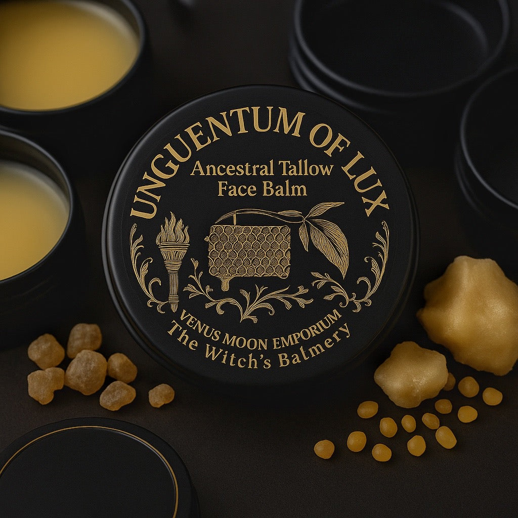 Crafted by hand in sacred rhythm, Unguentum of Lux is the first balm in The Witch’s Balmery — a rich, ancestral face balm made for witches who wear time like a veil and treat skincare as ritual.