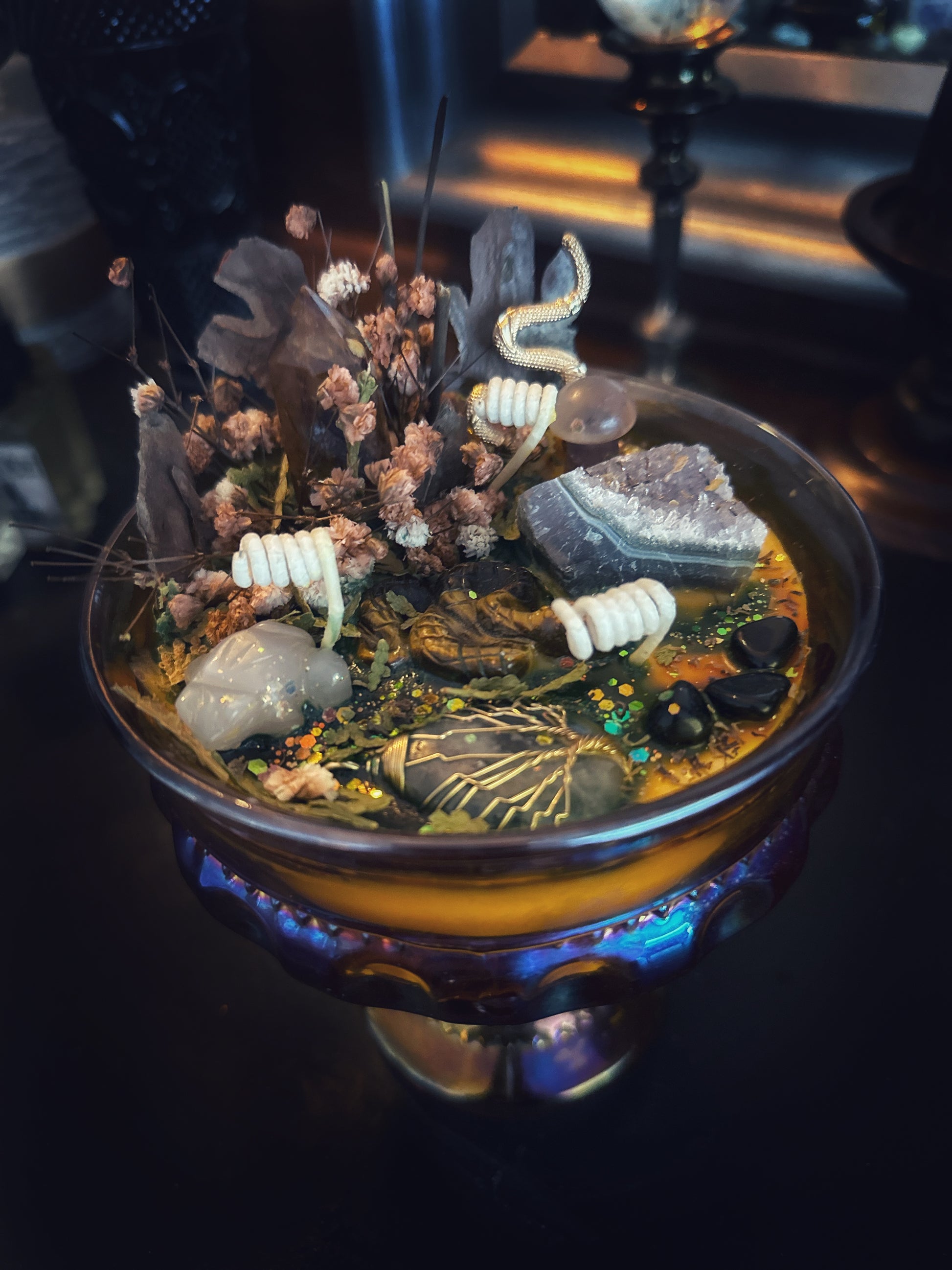 Complete with crystal forest critters like a tiger eye snake, agate tree frog, fluorite mushroom a Tree of Life quartz crystal amulet, golden healer quartz tower and a raw amethyst.